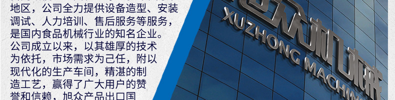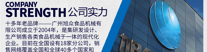 廣州旭眾食品機械有限公司是一家集科研開發(fā),生產(chǎn)設(shè)計,營銷服務(wù)為一體的現(xiàn)代化生產(chǎn)企業(yè)?,F(xiàn)代化生產(chǎn)車間,精湛制造技術(shù),所產(chǎn)機械歷經(jīng)市場重重考驗,不斷贏得海內(nèi)外客戶的贊譽。