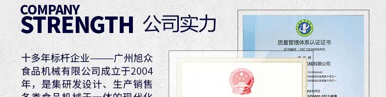 廣州旭眾食品機(jī)械有限公司是一家集科研開發(fā),生產(chǎn)設(shè)計,營銷服務(wù)為一體的現(xiàn)代化生產(chǎn)企業(yè)?,F(xiàn)代化生產(chǎn)車間,精湛制造技術(shù),所產(chǎn)機(jī)械歷經(jīng)市場重重考驗,不斷贏得海內(nèi)外客戶的贊譽。
