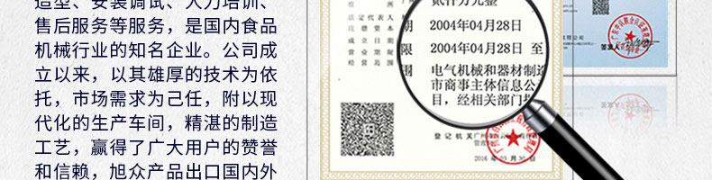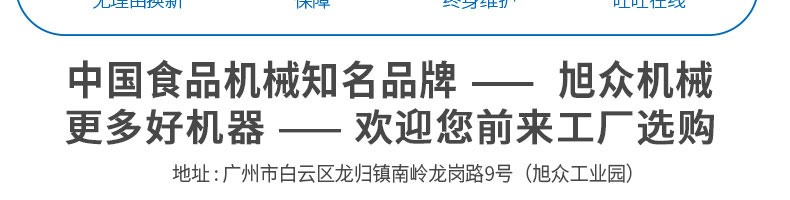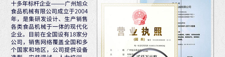 廣州旭眾食品機(jī)械有限公司是一家集科研開(kāi)發(fā),生產(chǎn)設(shè)計(jì),營(yíng)銷服務(wù)為一體的現(xiàn)代化生產(chǎn)企業(yè)?,F(xiàn)代化生產(chǎn)車(chē)間,精湛制造技術(shù),所產(chǎn)機(jī)械歷經(jīng)市場(chǎng)重重考驗(yàn),不斷贏得海內(nèi)外客戶的贊譽(yù)。