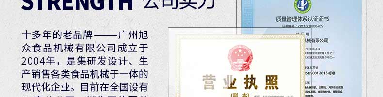 廣州旭眾食品機(jī)械有限公司是一家集科研開發(fā),生產(chǎn)設(shè)計(jì),營銷服務(wù)為一體的現(xiàn)代化生產(chǎn)企業(yè)。現(xiàn)代化生產(chǎn)車間,精湛制造技術(shù),所產(chǎn)機(jī)械歷經(jīng)市場重重考驗(yàn),不斷贏得海內(nèi)外客戶的贊譽(yù)。